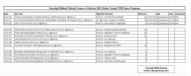 Sosyoloji Bölümü 2022 Bahar Dönemi Lisansüstü Vize Sınav Programı ektedir. Bütün öğrencilerimize başarılar diliyoruz.