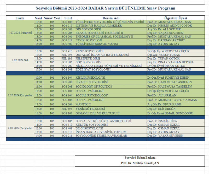 Sosyoloji Bölümü 2024 Bahar Yarıyılı Bütünleme Sınav Programı