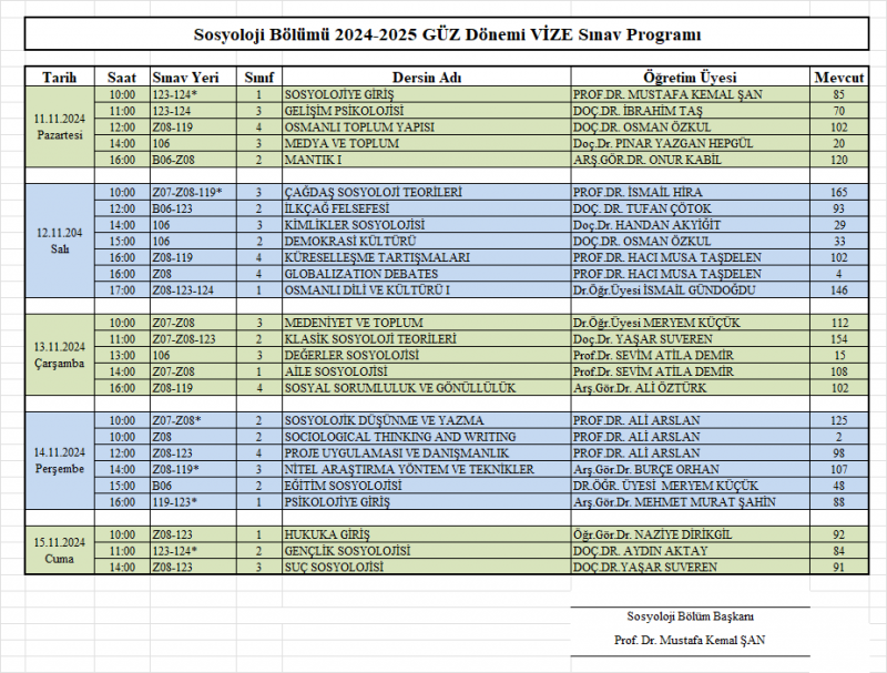 2024 Güz Dönemi Sosyoloji Bölümü, lisans, yüksek lisans ve doktora, formasyon ve Üniversite Ortak Derslerin Sınav Takvimi ektedir. Bütün öğrencilerimize başarılar diliyoruz.
