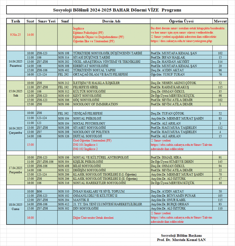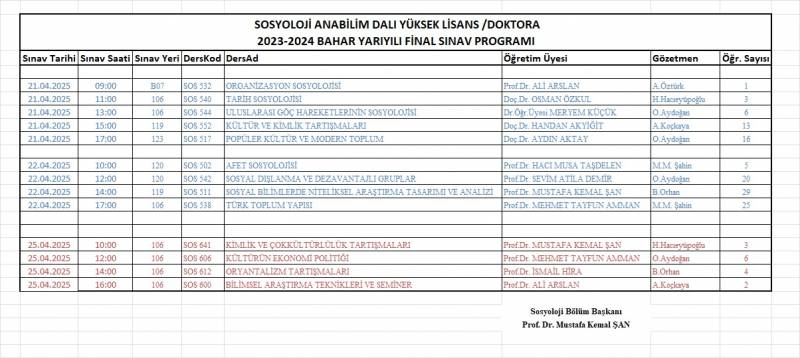 2025 Bahar Dönemi Sosyoloji Bölümü, lisans (14 - 18 Nisan 2025), lisansüstü, formasyon ve Üniversite Ortak Derslerin Sınav Takvimi ektedir. Bütün öğrencilerimize başarılar diliyoruz.